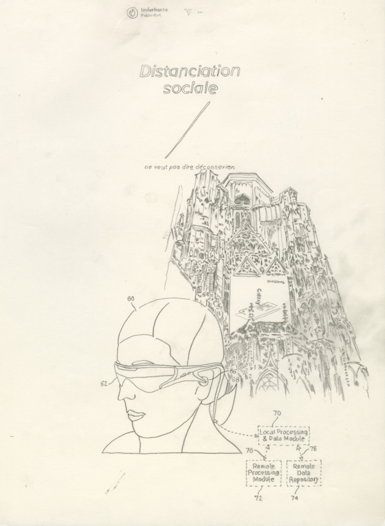Tasio Bidegain (Rietveld, Amsterdam), zat opgesloten in Parijs dat een zeer streng beleid kende, je mocht alleen naar buiten voor boodschappen en om je hond uit te laten, maar hij voelde zich fijn zo samen met zijn familie, en begon de fragmenten van de buitenwereld, die via zijn scherm de intieme binnenwereld binnen drongen, te tekenen. Gefragmenteerde beelden die in elkaar overvloeien worden getoond alsof ze via een virtual reality bril worden waargenomen, alsof de pandemie daar buiten niet te bevatten is als realiteit. We zien een stad opdoemen, veiligheidscamera’s, mensen met mondkapjes, een plantenbak. Zo ontrafelt hij zijn en ons gevoel van ongeloof over de bijna niet te bevatten realiteit van een onzichtbaar virus, als een film, een mirage. Zijn ingelijste tekeningen hangen in een lijn op de muur waarop drie getekende cirkels een samenkomst vormen van een deeltjesversneller en het oneindige kosmische.