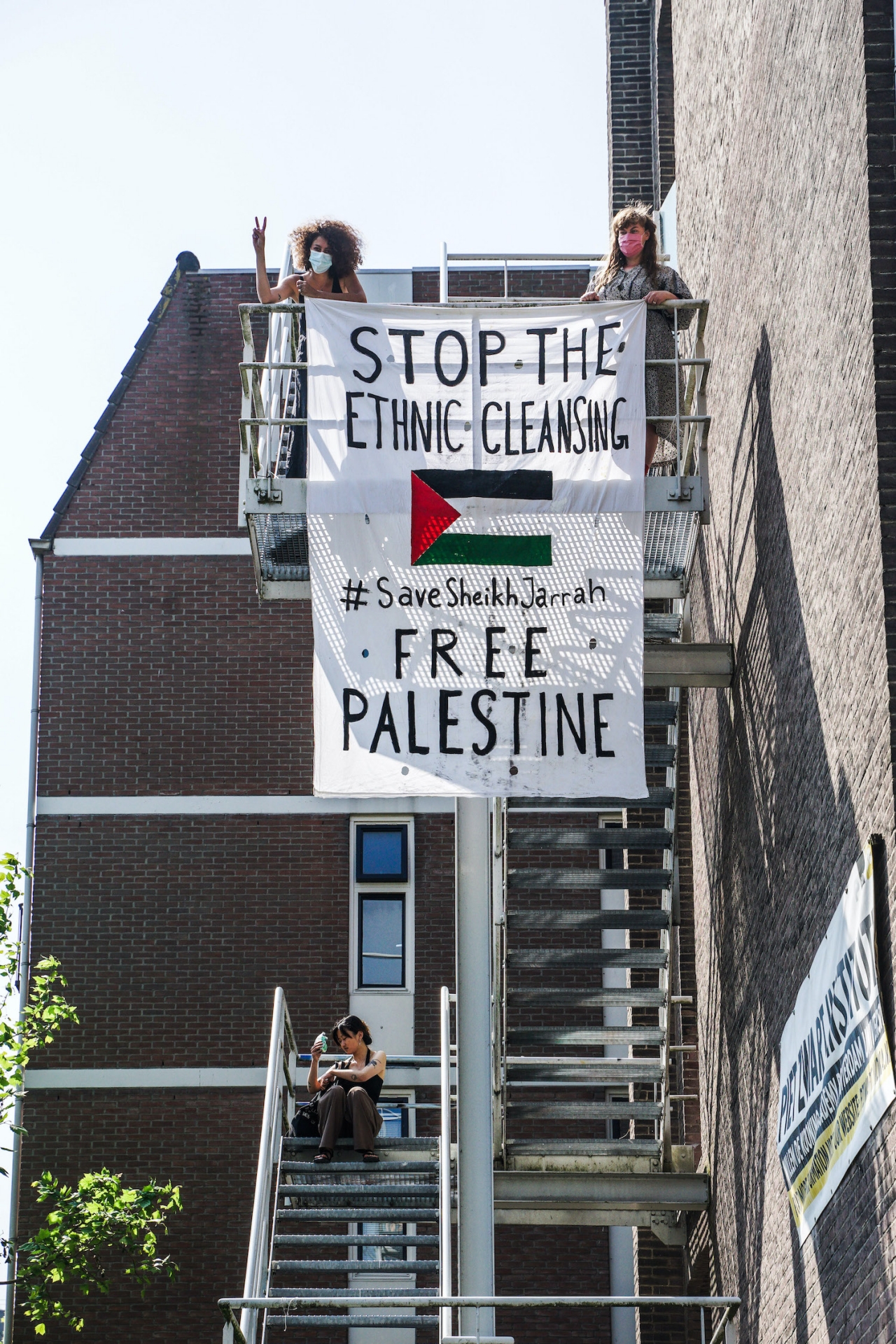 Toen de Libanese kunstenaar Diana Basyouni Al-Halabi vervolgens in haar eigen werkruimte bij het Piet Zwart Instituut posters op haar ramen bevestigde, werden die opnieuw verwijderd en werd gedreigd dat zij van de schoolterrein verwijderd zou worden. Al-Halabi en haar medekunstenaars in het programma, besloten daarop tot een collectieve performatieve actie: Holding Palestine (2021), waarbij studenten, solidaire docenten en publiek op de brandtrap voor de school afwisselend een protestdoek vasthielden. Ditmaal werd de banier niet verwijderd. De school had namelijk gesteld dat spandoeken niet mochten worden opgehangen, maar er was geen verbod op het vasthouden ervan.