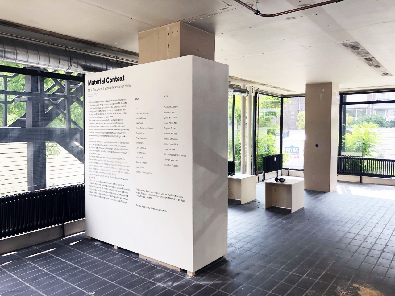 Al-Halabi’s nieuwste werk, The Official Apology of the Hogeschool Rotterdam (2021), dat sinds 1 juli in de afstudeertentoonstelling van het Piet Zwart Instituut in het voormalig stadsarchief van Rotterdam te zien is, vormt een krachtig voorbeeld van de wijze waarop emancipatorische propagandakunst zowel nieuwe werelden kan verbeelden als in praktijk kan brengen. Het werk sluit aan op de geschiedenis van de institutionele kritiek, en neemt de vorm aan van een alternatieve tentoonstellingstekst waarin de directie excuses aanbiedt voor hun ondermijning van de solidariteitsprotesten van studenten en docenten: “we were in fact practicing surveillance as we acted blind.” En de directie gaat in de tekst een stap verder: