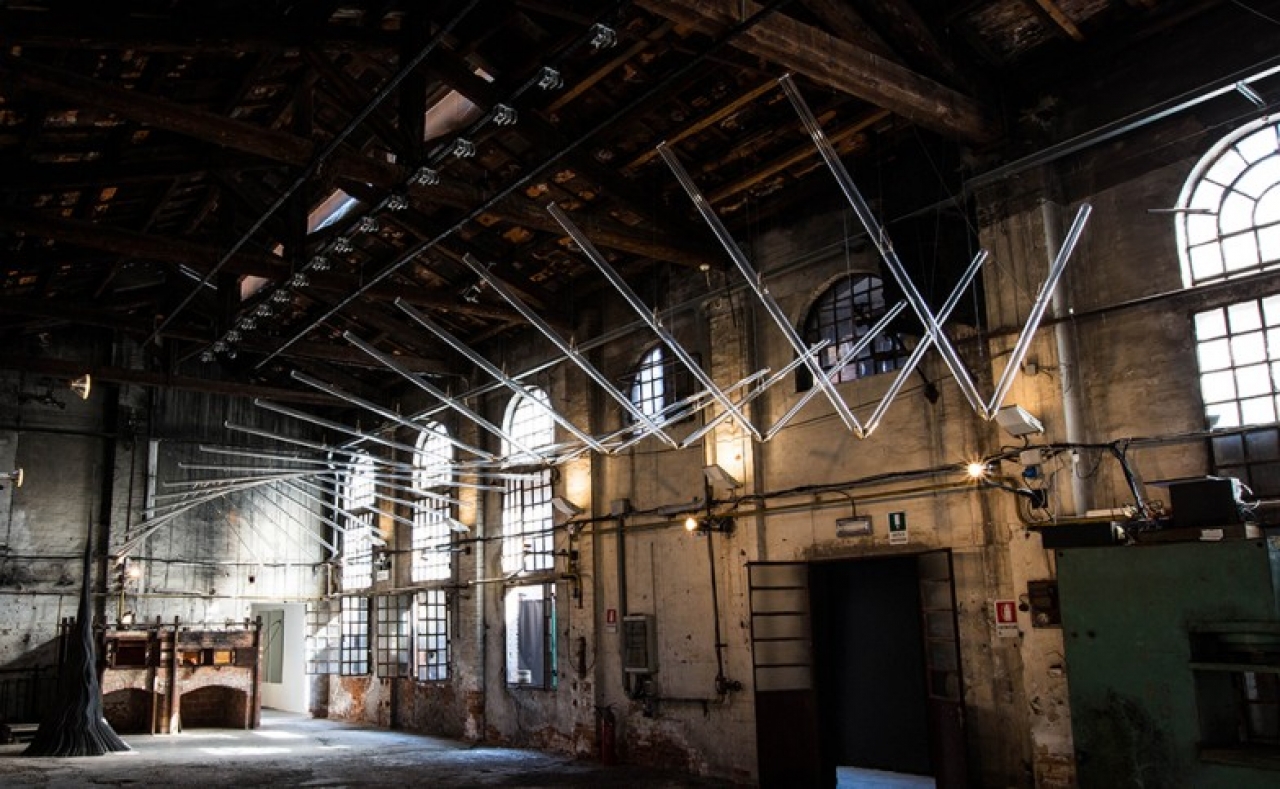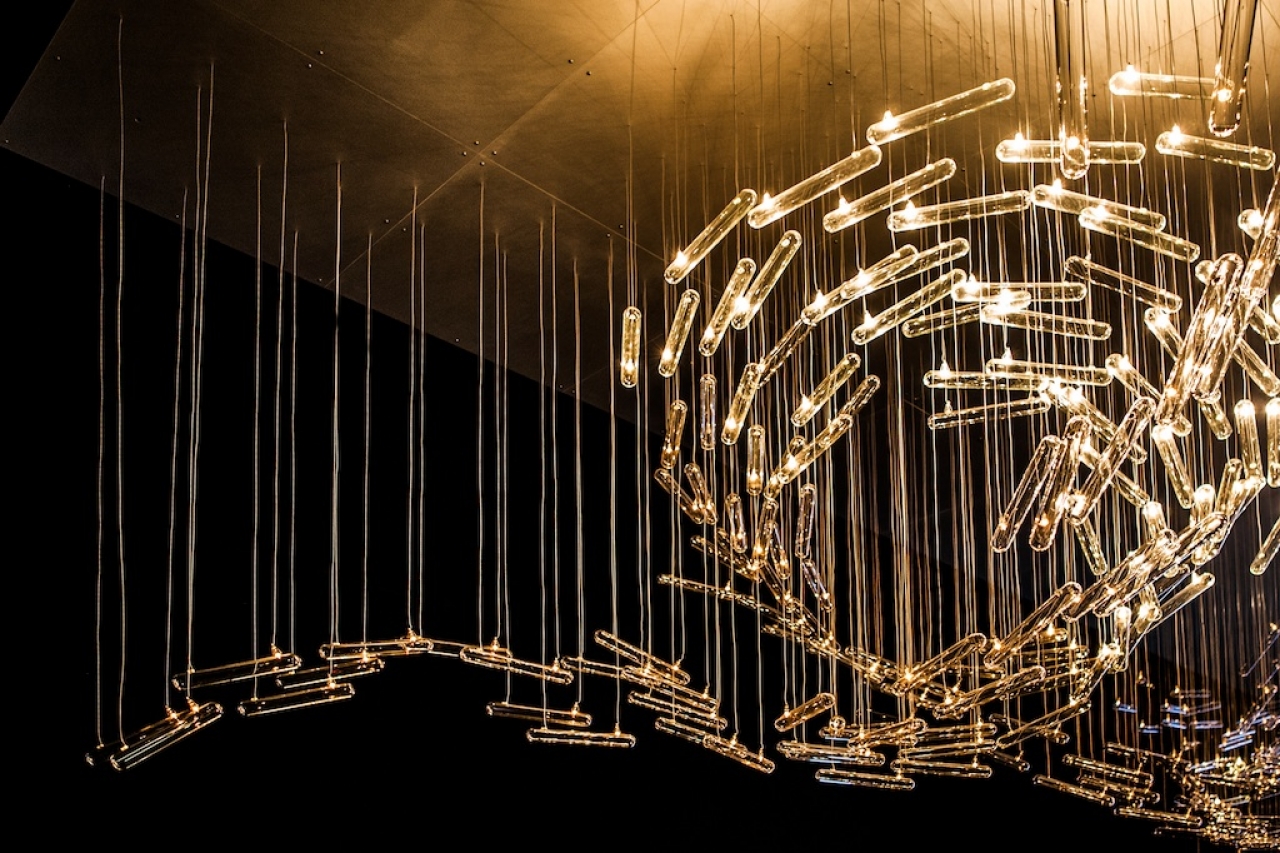 Flylight (2007) is a site-specific light installation that directly interacts with its surroundings. It consists of delicate glass tubes that light up in an unpredictable way, partially responsive to external stimuli. The light mimics the behavior of a flock of birds in flight, symbolizing the conflict between the safeness of the group and the freedom of the individual.