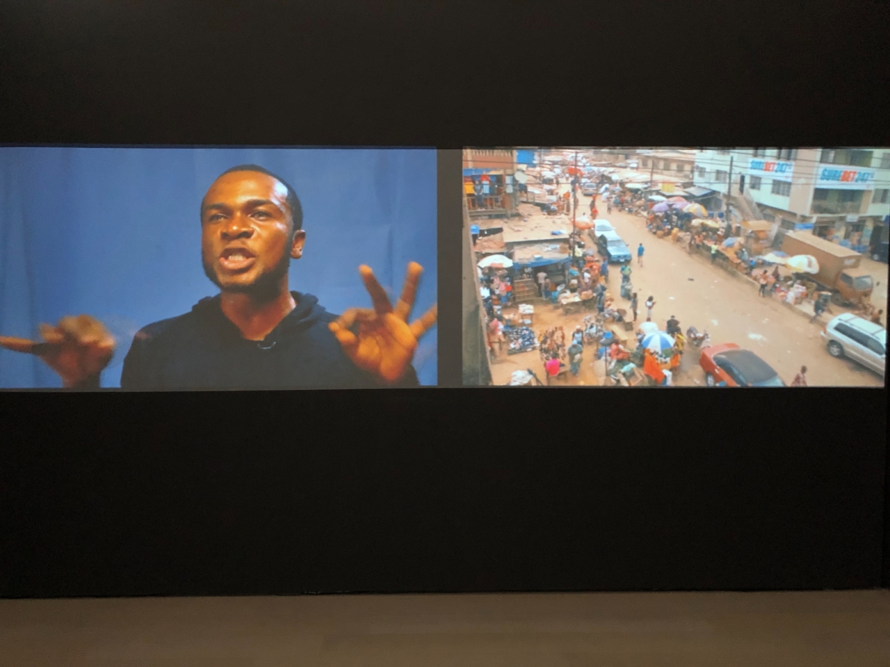 In een afgeschermde hoek in de ruimte wordt de video-installatie Tell Am As You See Am van Tyna Adebowale afgespeeld. Adebowale werkt veel samen met de queer gemeenschap in Lagos en pleit voor hun zichtbaarheid. Ze strijdt daarmee voor een vrij en veilig Nigeria waar plek is voor iedereen. Adebowale laat met haar werk zien dat door het kolonialisme en het daarbij horende christendom de samenleving van Nigeria compleet is vervormd. Het corrupte conservatieve systeem wordt in haar werk aangepakt. Zo worden in de video-installatie Tell Am As You See Am twee projecties naast elkaar gezet. Het ene beeld toont een pratend persoon, wiens woorden door de ruimte heen galmen en het ernaast geprojecteerde beeld toont scenes van drukke plekken in de stad Nigeria. De man en vrouw die elkaar afwisselen op het linker scherm praten om en om gepassioneerd en sterk over de Nigeriaanse samenleving. Dit land heeft volgens hen actie nodig, ze spreken over de bijbel, de hoognodige aanpassingen voor vrouwen en mannenrechten in het land en stellen niet bang te zijn voor deze weg naar verandering. De stemmen informeren de toeschouwer en als ik de ruimte weer verlaat hoor ik hen nog net zeggen: “we need action.”