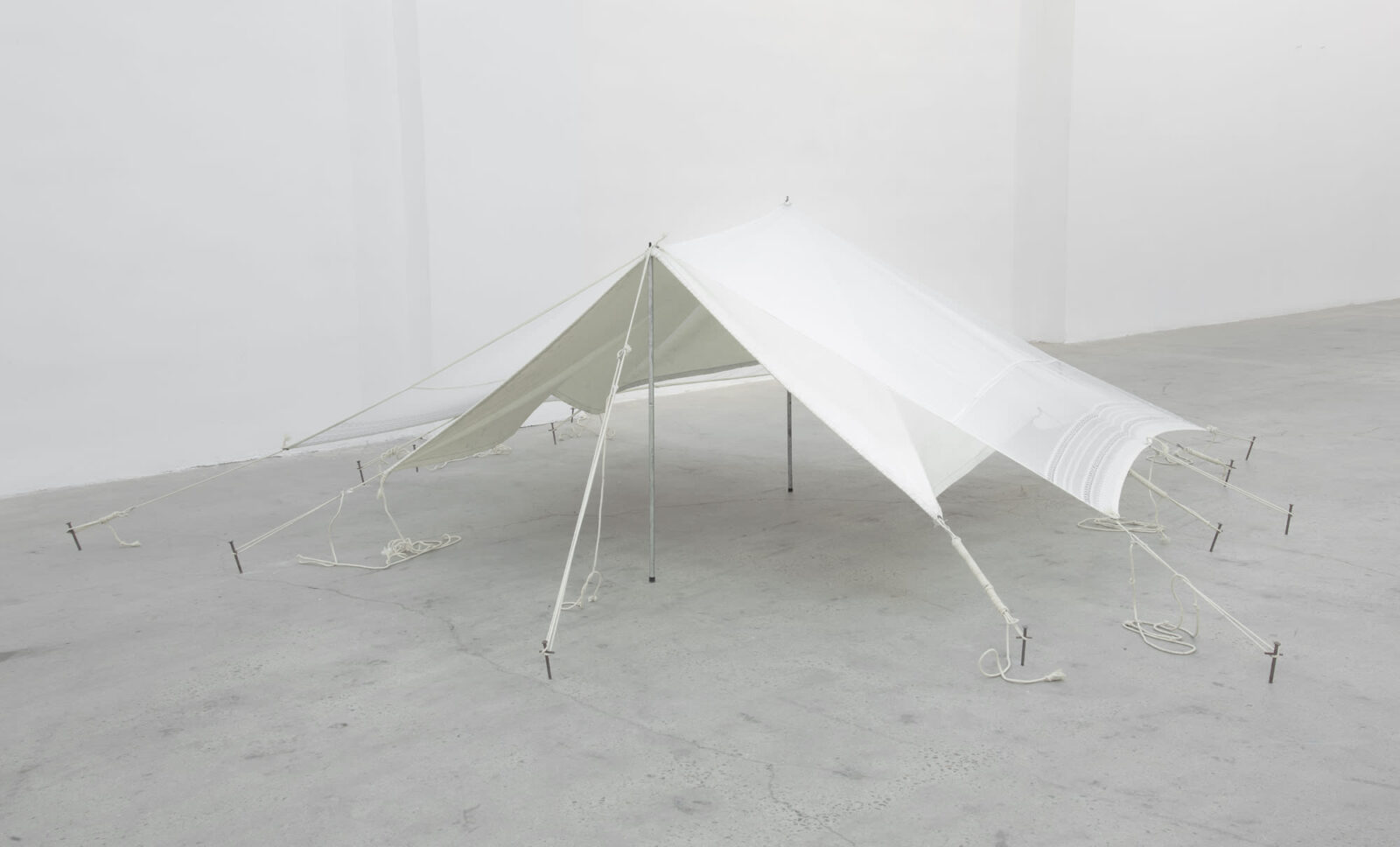 ‘De Nederlandse nietsigheid en de platte horizon ga je vast missen nadat je een tijdje in het buitenland verblijft. Ik mis het nog niet. Eerst een ontsnapping. En een lome zomer met veel verveling.’ Die zomer roept bij Pum van de Koppel de tentsculpturen van Ger van Elk in gedachten, waarbij het non-functionele een eerbetoon aan de verbeeldingskracht wordt.
