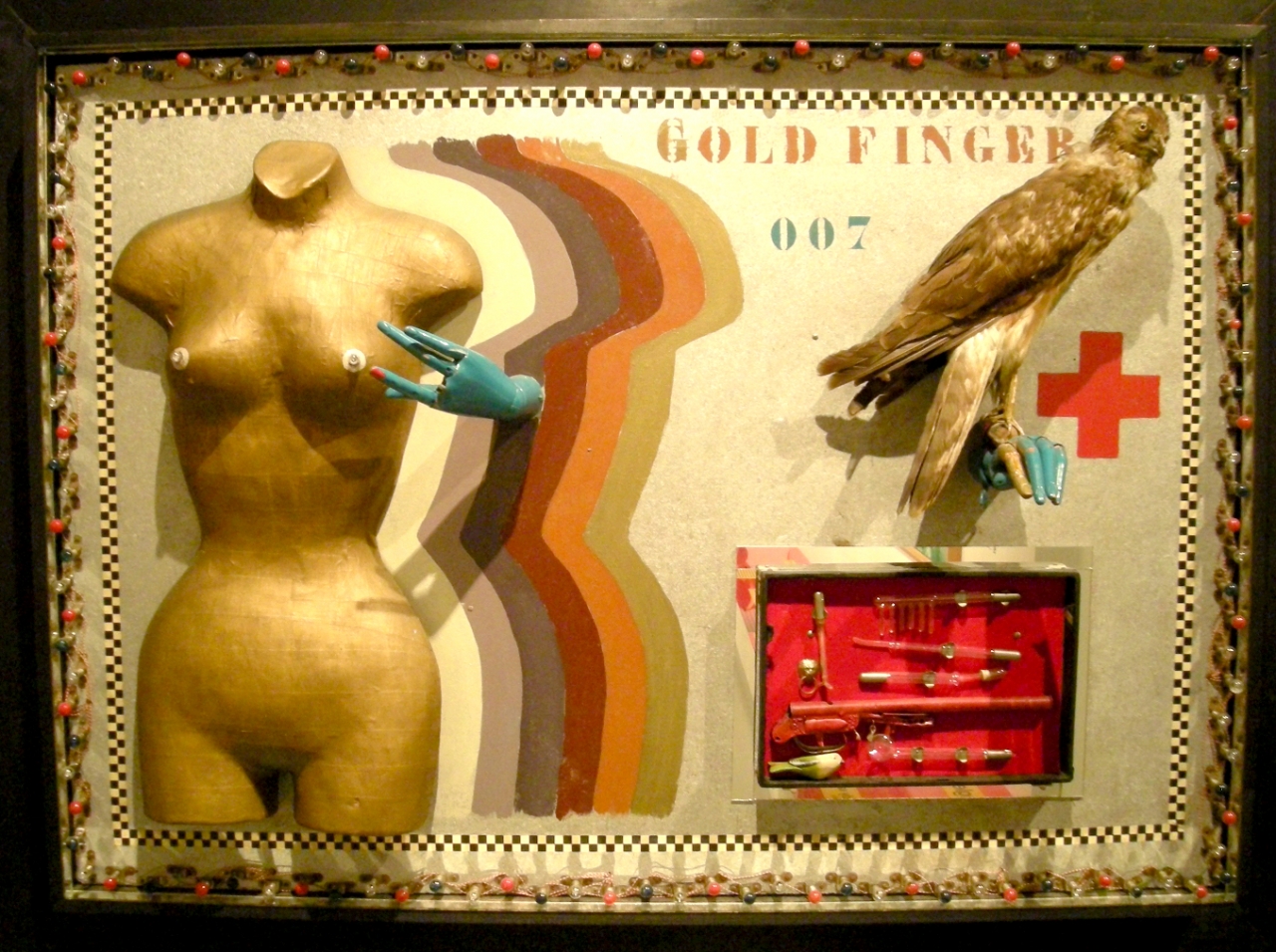 Even verderop hangt een werk dat Van Amen twee jaar later maakte: Goldfinger, een assemblage. Goldfinger heeft wat van een kijkdoos, met daarin verschillende interessante objecten. Links vinden we bijvoorbeeld een goudkleurig gedeeltelijk vrouwenlichaam, en rechts een hand met een opgezette vogel erop. Ook opvallend: de woorden ‘GOLD FINGER’ en het getal 007. Je hoeft geen al te grote filmliefhebber te zijn om in elk geval die laatste verwijzing thuis te brengen: James Bond (wiens naam en nummer ook een merknamen zijn geworden). Goldfinger is een James Bond-film uit 1964, die vernoemd is naar de schurk uit die film. De hand met de vogel heeft één gouden vinger. Ook het gedeeltelijke vrouwenlichaam verwijst naar de film: Goldfinger beschildert Bondgirl Jill Masterson geheel met goudverf, waardoor ze stikt. Die scène maakte zo’n indruk dat er al snel hardnekkige geruchten gingen dat Shirley Eaton, die Masterson speelde, daadwerkelijk overleed aan de gevolgen van de beschildering. De verwijzingen geven de assemblage anno nu iets heel typisch jarenzestigs, maar moeten het werk destijds een zeer actuele uitstraling hebben gegeven.