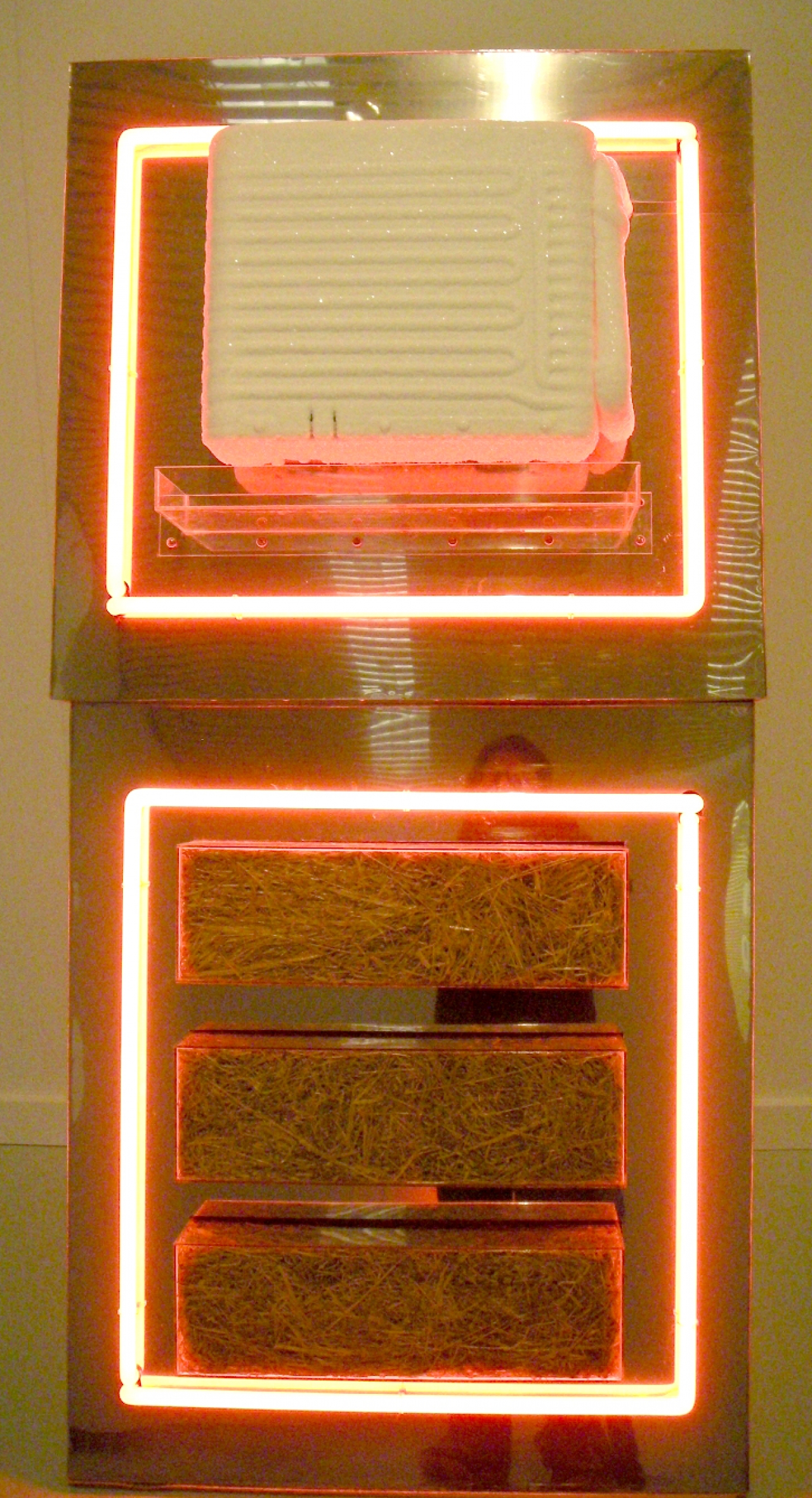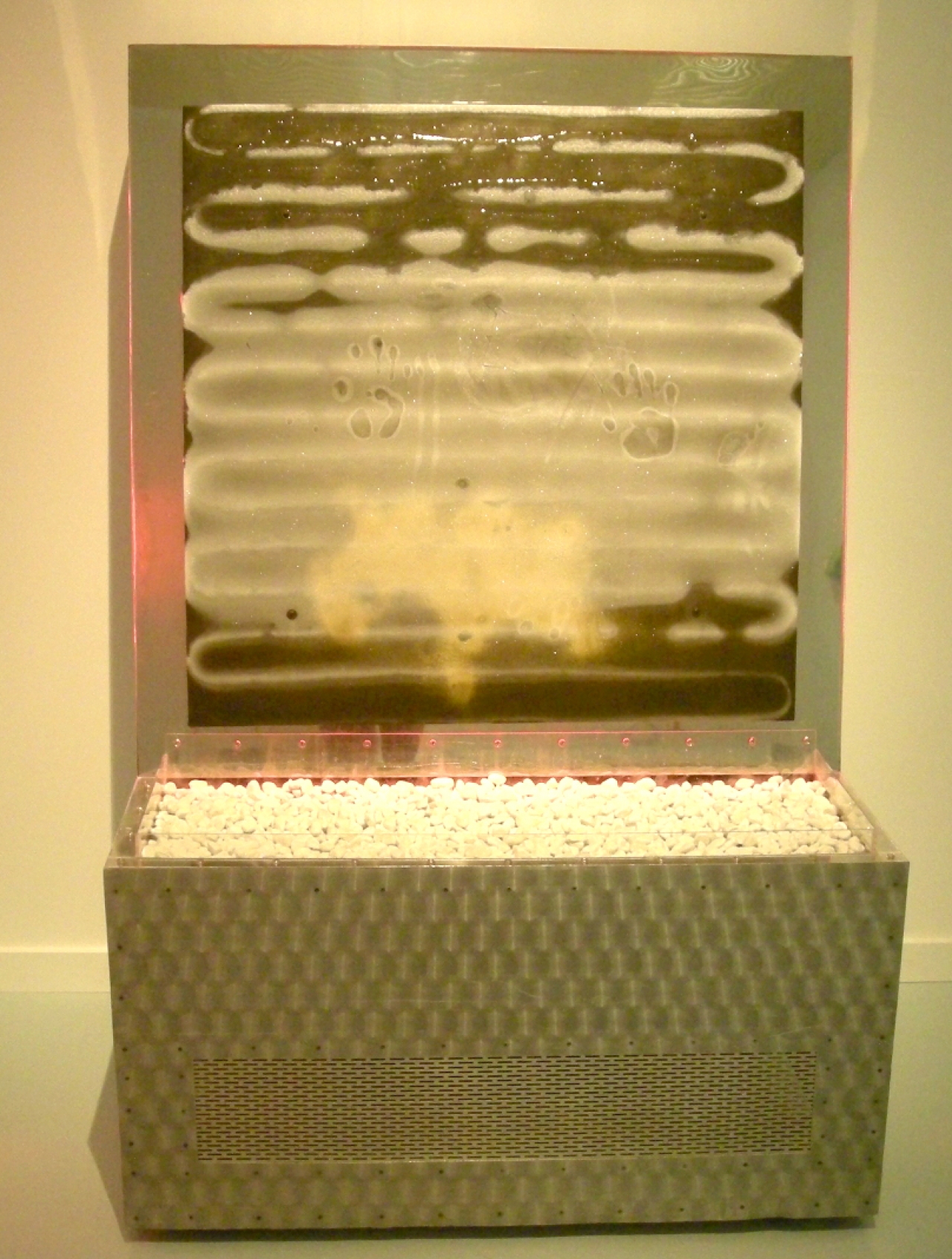 In elk geval, de restauratie van een van die machines was aanleiding voor het Valkhof om een aantal van Van Amens werken tentoon te stellen. De twee ijsobjecten, zoals ze op de begeleidende bordjes genoemd worden, zijn opvallend sereen en lijken zelfs in zichzelf gekeerd. Ze doen eigenlijk niets anders dan ijs maken; een bepaald oppervlak bevroren houden. Het ene object houdt een koelelement en een paar bakken stro bevroren, het andere twee afdrukken op een plaat. Welbeschouwd doet een schilderij eigenlijk ook niets anders dan een schilderij zijn, maar van machines wordt blijkbaar meer nut verwacht. De ijsobjecten lijken bovendien buitenbeentjes, vergeleken met het andere werk van Van Amen in het Valkhof.
