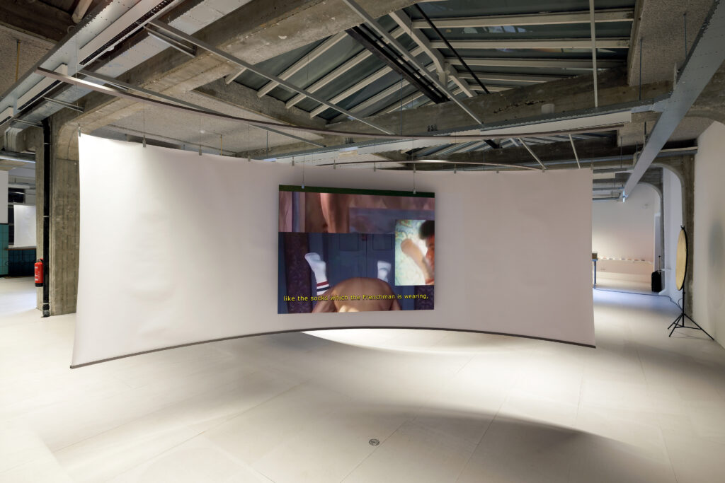 De relatie tussen de ondergaande zon, queerness en racisme wordt vaker gelegd in deze tentoonstelling. Ook in het geweldige videowerk Come with me to France van Alaa Abu Asad. In 2012 vond hij een pornofilm waarin een witte jongen met licht haar in het decor van een Noord-Afrikaanse Souk met verschillende mannen seks heeft. Alaa Abu Asad heeft de film bewerkt en herteld. Onder de onverbloemde pornografische beelden horen we zijn stem die laat weten dat hij de film bekijkt, bewerkt, knipt, dat hij erover schrijft en tegelijkertijd opgewonden raakt van de beelden, terwijl de stereotiepe, koloniale kijk op deze Noord-Afrikaanse mannen pijn doet, woedend maakt. Met zijn ingrepen vervormt hij het relaas tot een zachter, intiemer en liefdevoller verhaal. En die ontwikkeling loopt synchroon met het afnemende licht. De verliefde blik krijgt ruimte wanneer de zonnestralen minder fel worden, de contrasten minder belangrijk worden, intimiteit de ruimte krijgt. Met op de achtergrond de ondergaande zon.
