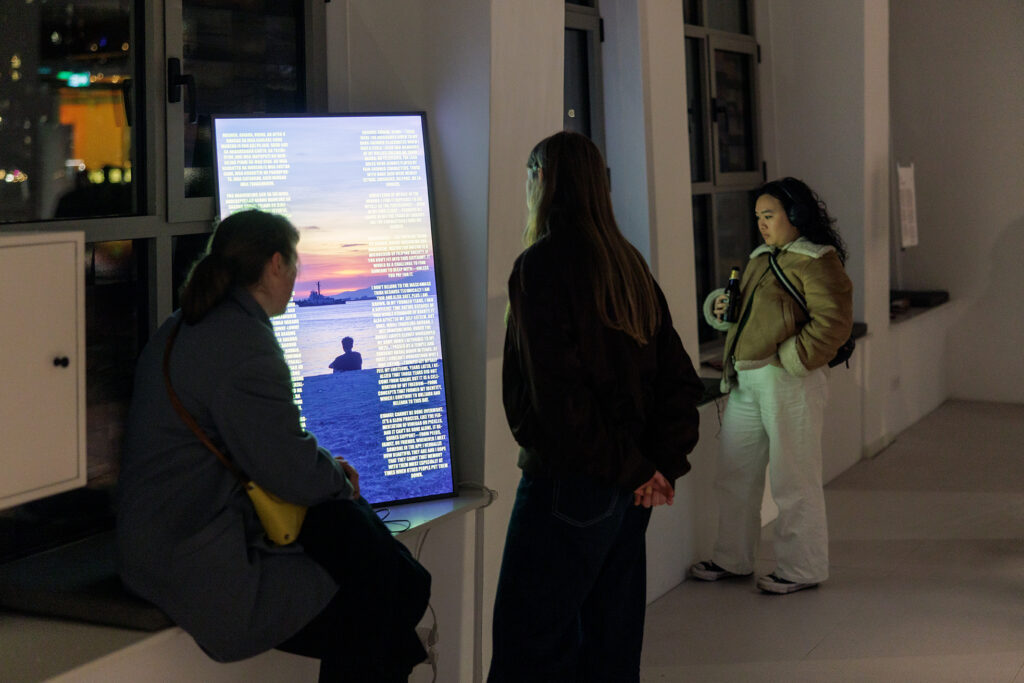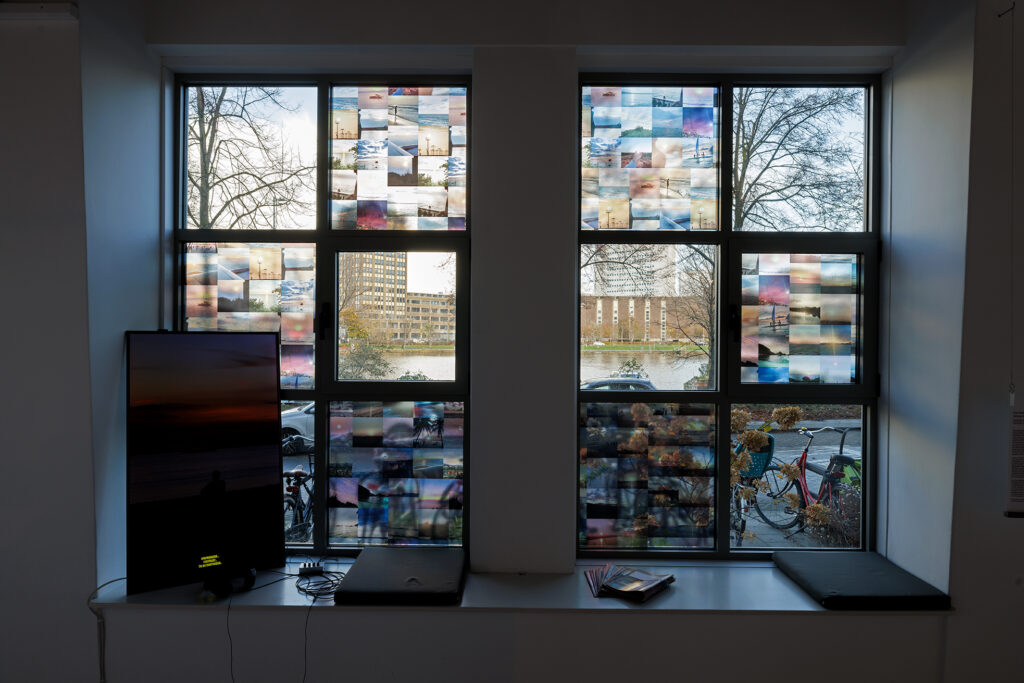 Binnen loop ik direct door naar de raamstickers. Het blijkt een verzameling profielfoto’s te zijn van Grindr, de homodatingapp. De kunstenaar Czar Kristoff J.P. verzamelde de foto’s uit de Filipijnse versie van deze app. Hij stelde de mannen, met een zonsondergang als profiel, twee vragen: heb je de foto zelf gemaakt en waarom koos je ‘m als profielfoto? De mannen die hem antwoordden – er waren er ook die hem direct blokkeerden – hadden de foto zelf gemaakt. Ja, het was een moment dat ze zelf hadden beleefd. En ze hadden het als profielfoto gekozen omdat het beeld iets van henzelf prijsgaf. De mens herkent zich in een hemelfenomeen.