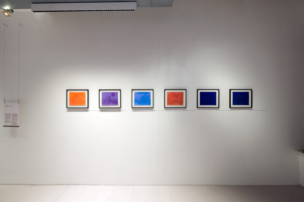 Kijk naar mij – die lokroep klinkt vanuit deze pasteltekeningen. Aan de muur hangen zes kleurvlakken van links naar rechts: oranjerood, blauwpaars, zeeblauw, rood, diepblauw en nogmaals diepblauw. Ik kom dichterbij – kijk naar me – en zie dan in de kleurenvlakken lijnen, vormen, schakeringen. Lommer, zweem, glimp. Zie ik een arm, een nek, oren van een hond? Zie ik benen, een lichaam? De kleuren worden rijker naarmate ik me meer beweeg. Het paars wordt gortdroog lila en dan vloeiend, meanderend groen. Ik laat mijn ogen van de ene naar de andere tekening glijden en in dit spel verkleuren ze elkaar, vermengen ze met elkaar, raken ze elkaars schoot. Onder de tekeningen staan op de muur de titels afgedrukt: