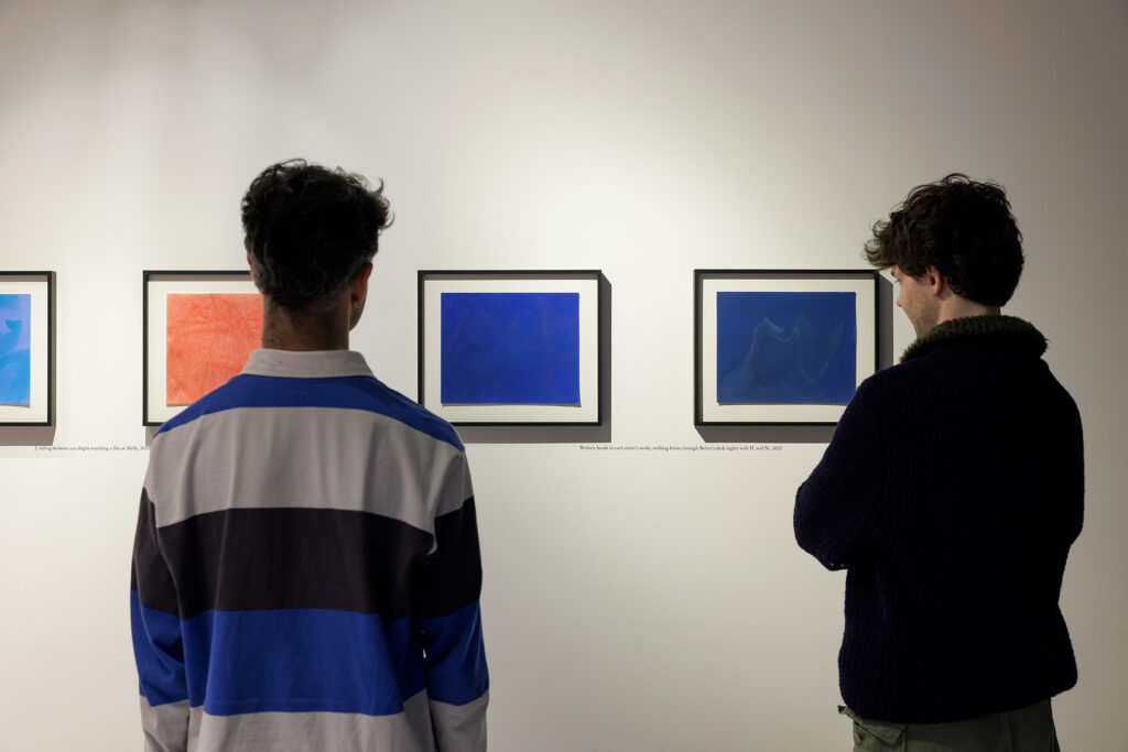 Poëtische titels voor intieme scènes, van zo dichtbij. In de tekeningen raakt iedereen elkaar; terloops, beoogd, gedurfd. Aanrakingen die door het afgenomen licht, en daarmee ons afgenomen zicht, duidelijk voelbaar zijn. De tijd van een ondergaande zon is het uur van het grootste menselijke orgaan: de huid. Elke beroering, elk zuchtje wind, elke straal warmte wordt intens en intiem. Voelen verdiept zich wanneer onze blik onnauwkeuriger wordt. Ik sta dichtbij: letterlijk met mijn neus er bovenop, wil deel worden van deze intimiteit. Zoals ik naar een zonsondergang kijk, zo kijk ik naar deze pastels.