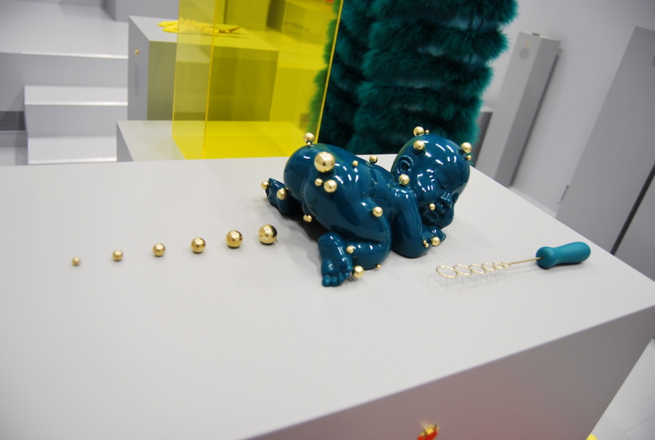 ‘Zou het goed doen in de schiettent,’ hoor je een man zeggen over een voorwerp dat door van Klaveren is veranderd in een glanzende turquoise Buddha-baby die gouden parels poept. ‘Deze voorwerpen doen me denken aan mijn vader’, zegt een vrouw over een roze paar slippers. Veel van de stukken zijn fabricaties met de schijn van een conventioneel, gangbaar object, maar waarbij de hang naar logica op een dood spoor uitkomt. Het zijn reproducties van gebruiksvoorwerpen, vertroebeld door de subjectieve invulling van de ontwerper.