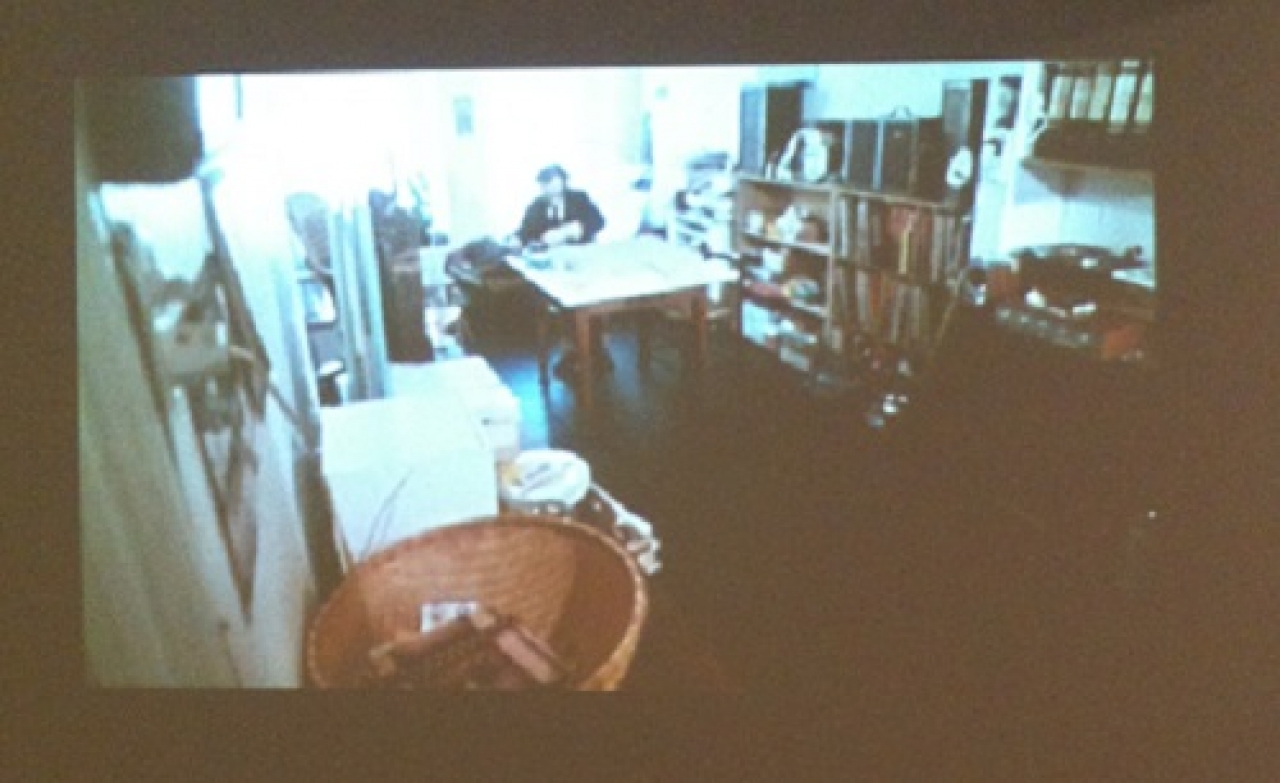 Shot uit video over Jan Schoonhoven. Schoonhoven thuis aan tafel aan het werk.